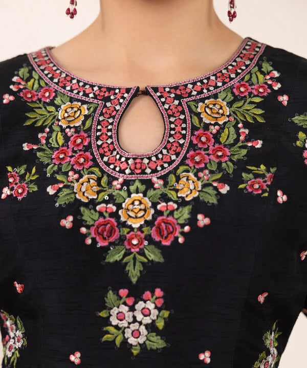 Dyed With Embroidered And Sequins Front Panel, Dyed With Embroidered And Sequins Back Panel, Round With Keyhole Neckline, Full Sleeves, Short Length