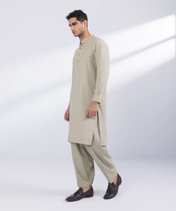 Leave a lasting impression this season in our coffee, wash & wear straight kurta and shalwar with embroidery.