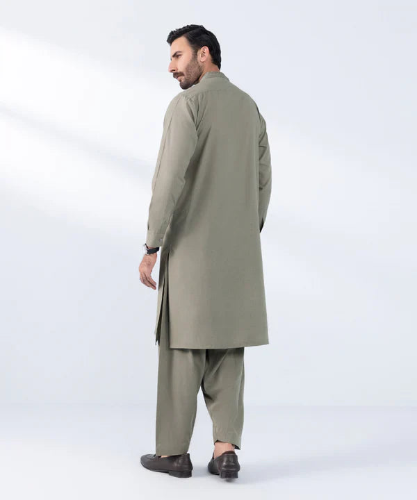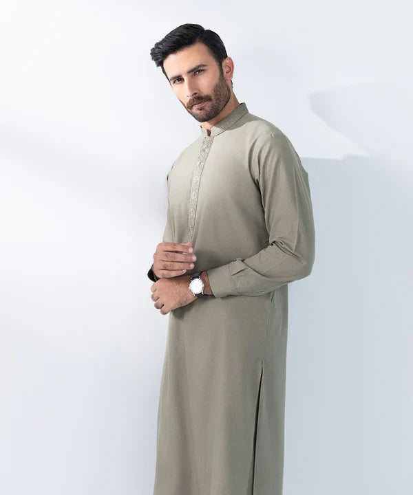 Embrace sophistication with our meticulously embroidered coffee, wash and wear kurta shalwar.