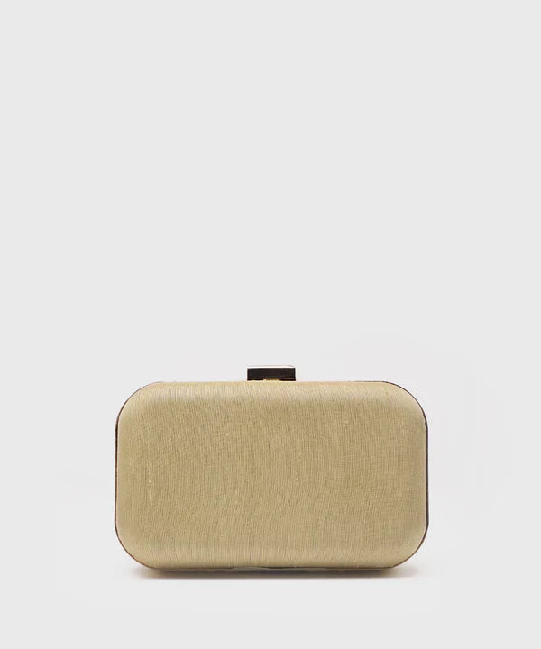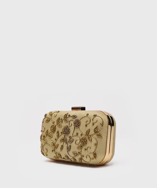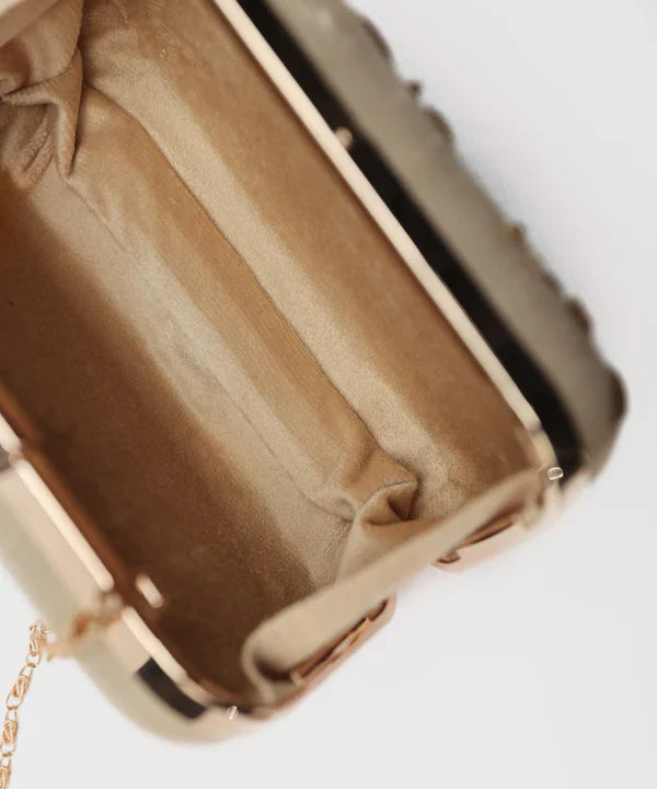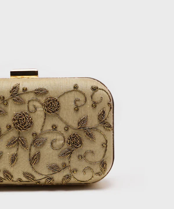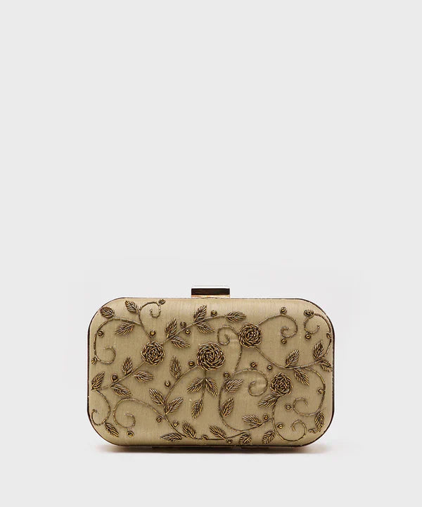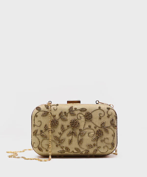 Perfect your festive style with our golden, rectangle hard clutch featuring adda work detailing and comes with a chain.
