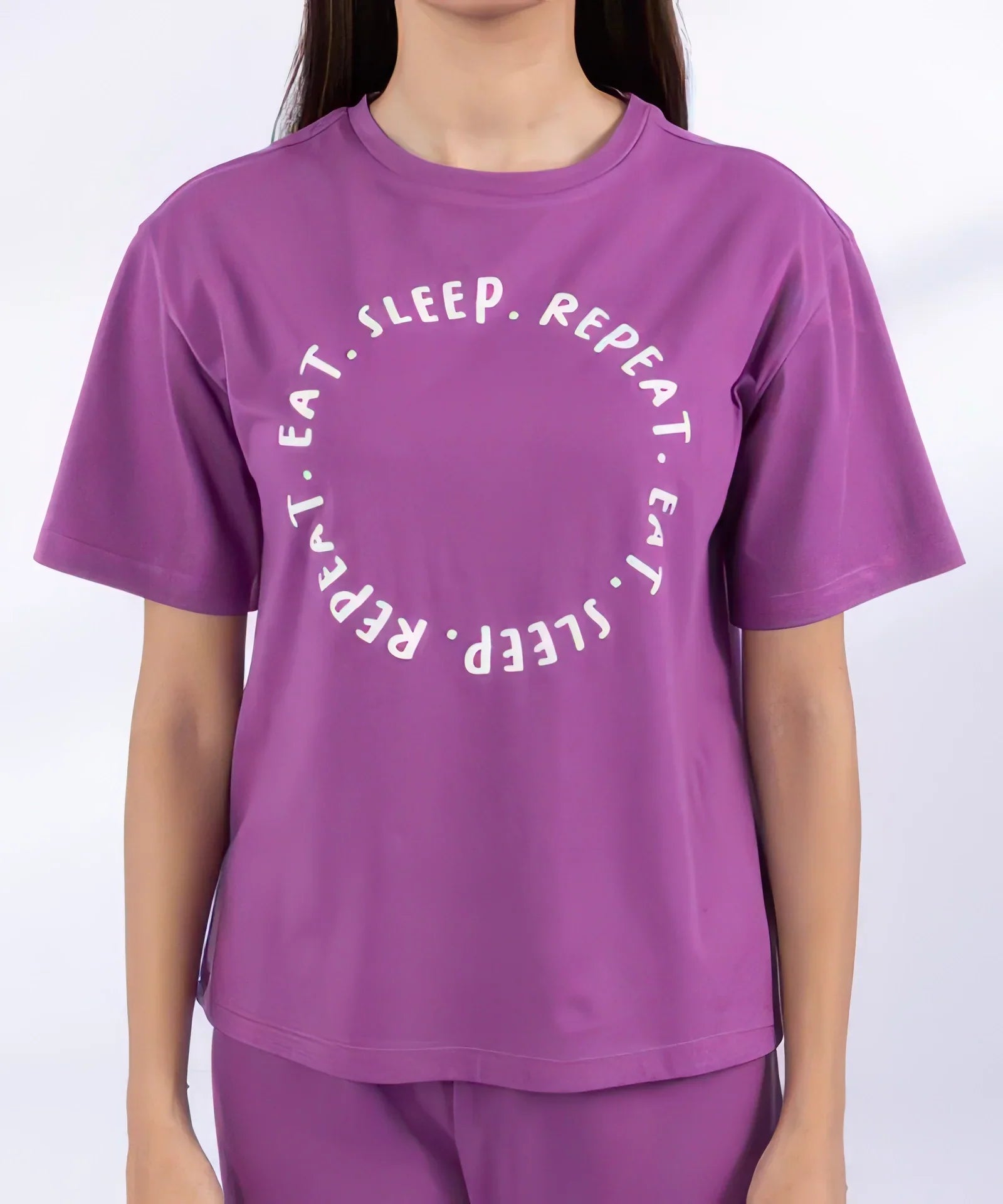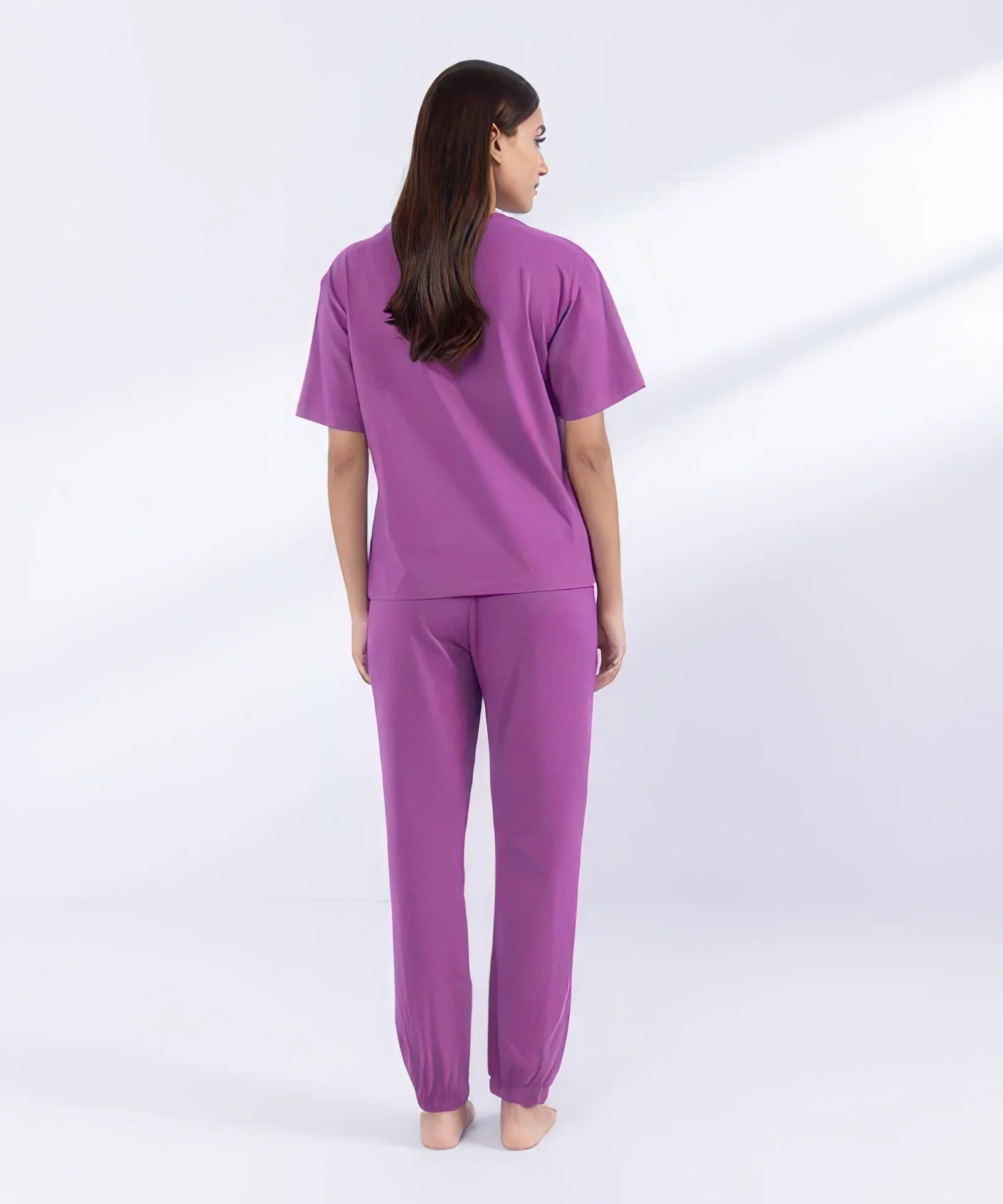 Solid loose fit T-shirt with embossed graphic printing. Crew neck with short sleeves. Jogger pants with elasticated waistband and cuffs with drawcord.