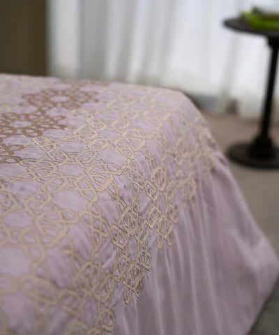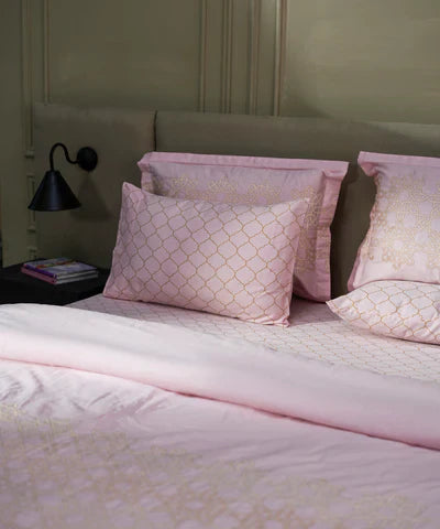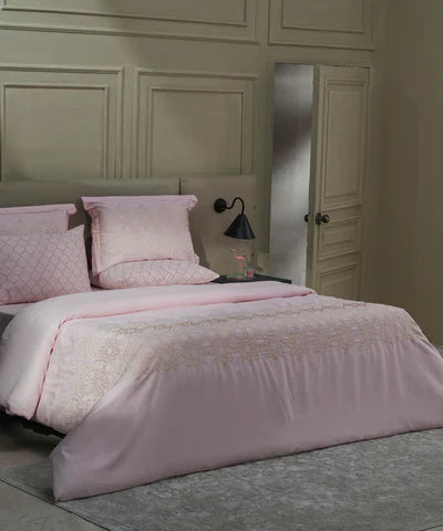 Refresh your winter space with our printed and embroidered Pink and Gold Bed in a Bag including a flat sheet, pillow cases, comforter and standard shams.