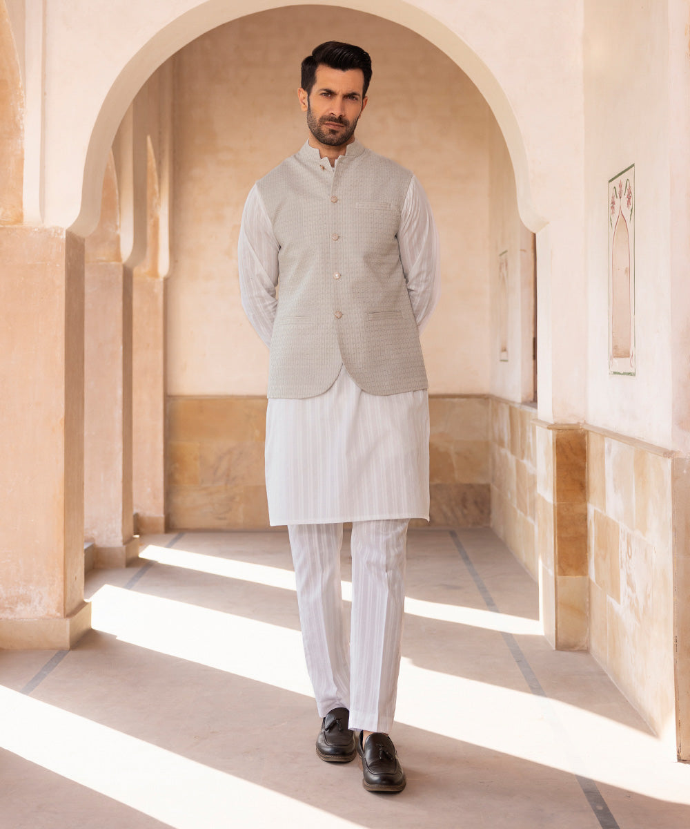 Elevate your everyday style in our white cotton dobby straight kurta and trouser.