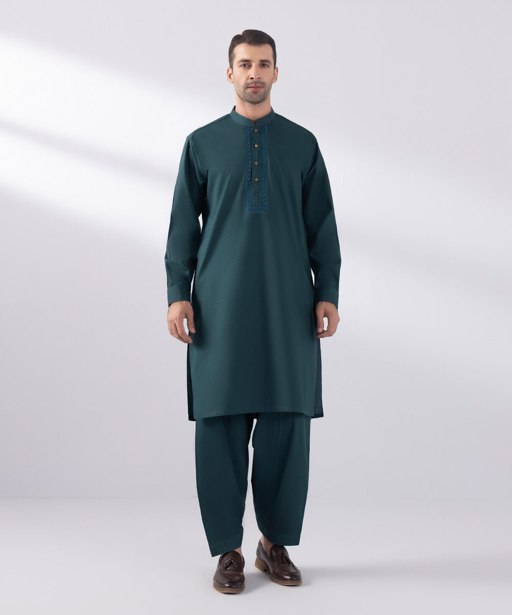 Embroidered Front, Plain Back, Full Sleeves with Cuff, Band Neckline