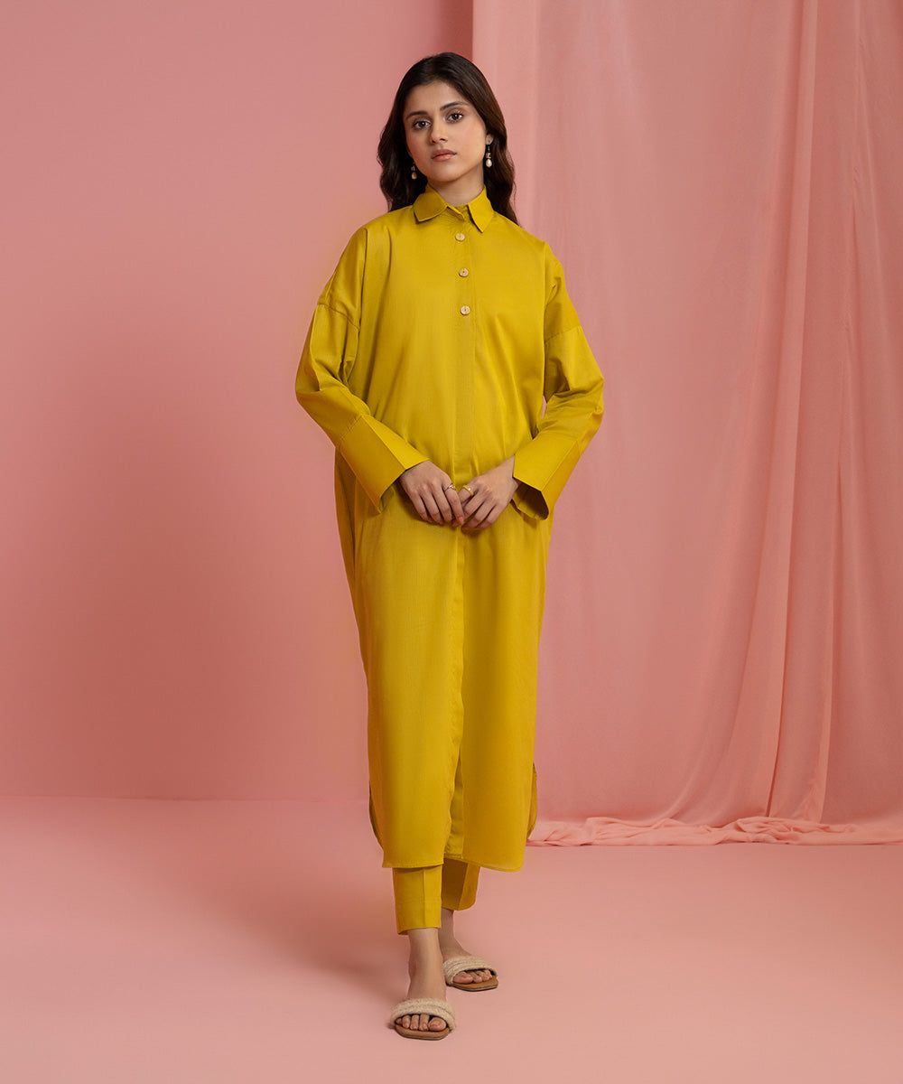 Look effortlessly stylish this summer with this stitched front-open mustard solid lawn kurta featuring collar neckline. Pair with matching mustard trousers to complete the look.