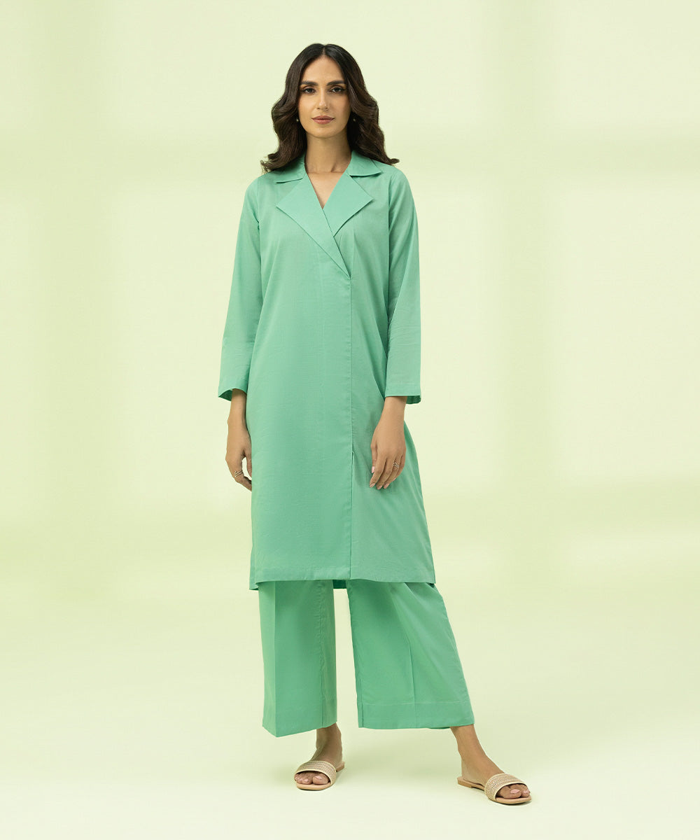 Upgrade your wardrobe with refreshing boxy kurta in green with a collar.