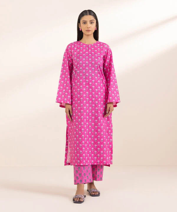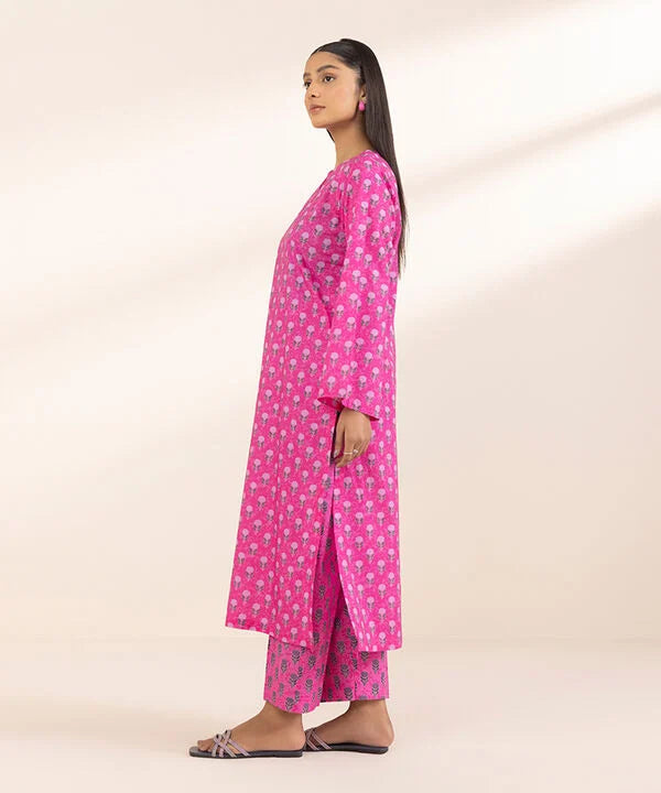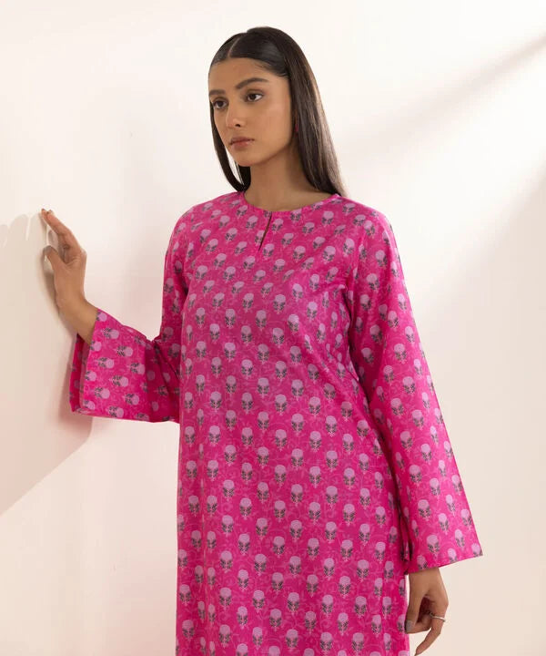 Complete your seasonal wardrobe with our hot pink printed, A-line shirt in lawn featuring a round neckline with a slit.