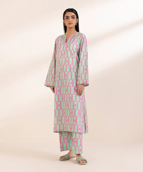 Complete your seasonal wardrobe with our green printed, A-line shirt in lawn featuring a band neckline with a slit.