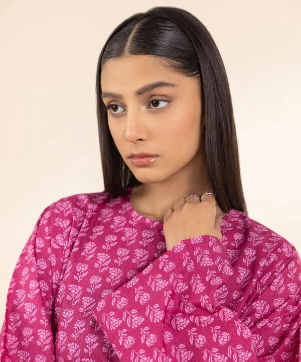 Complete your seasonal wardrobe with our magenta printed, A-line shirt in lawn with a round neckline.
