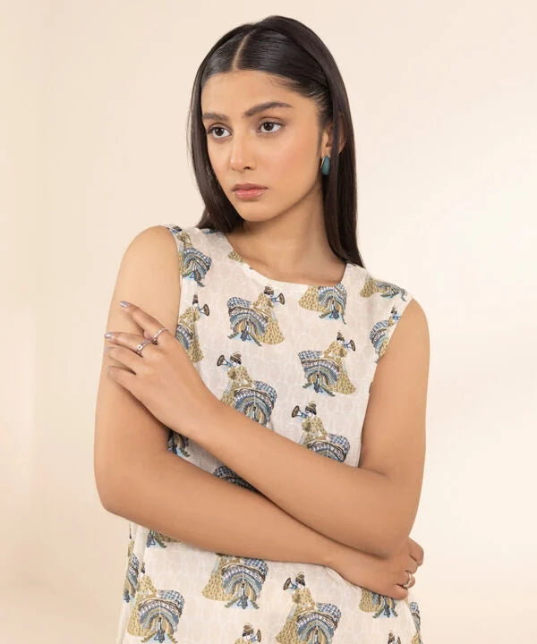 Complete your seasonal wardrobe with our cream white printed, straight shirt in textured lawn with a round neckline.