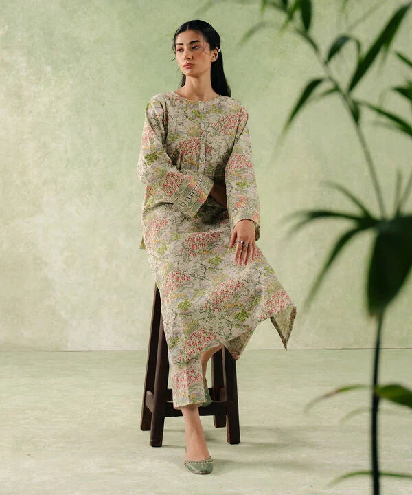 Printed Front Panel, Printed Back Panel, Round With Placket Neckline, Full Sleeves, Long Length
