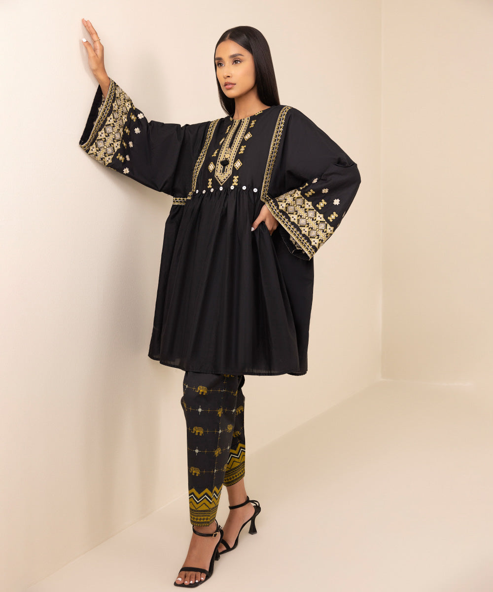 Elevate your style with our dyed black, flared embroidered shirt accented with a round neckline with slit.