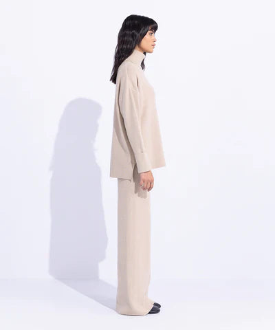 Loose-fit ribbed sweater with turtle neck. Full sleeves and side slits.