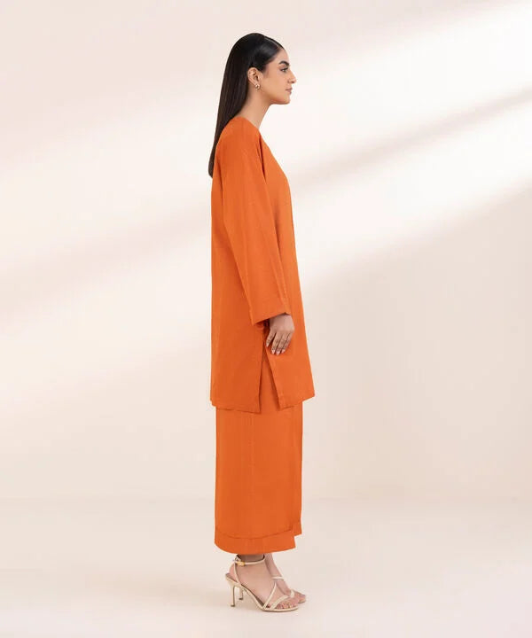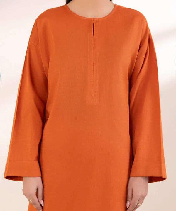 Complete your seasonal wardrobe with our orange dyed, A-line shirt in dobby featuring a round neckline with a slit.