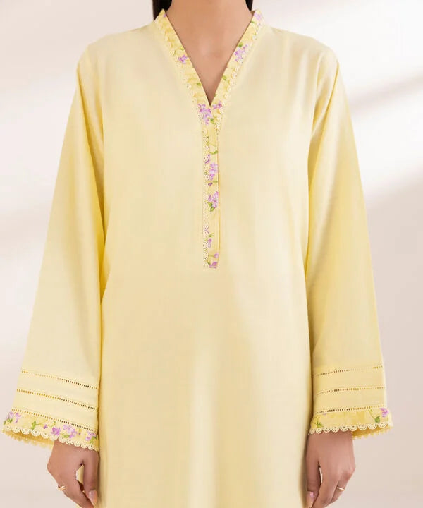 Complete your seasonal wardrobe with our yellow dyed, A-line shirt in dobby with a y-neckline.