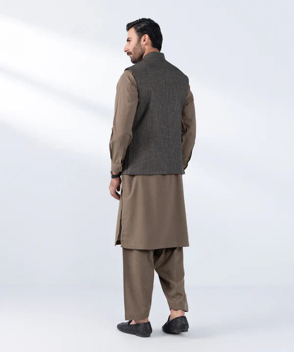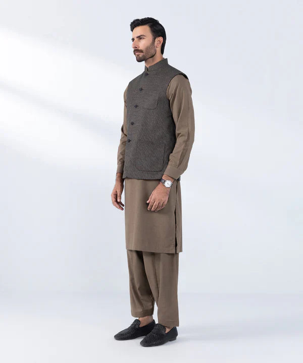 Embrace sophistication with our meticulously tailored solid brown, premium tropical waistcoat.