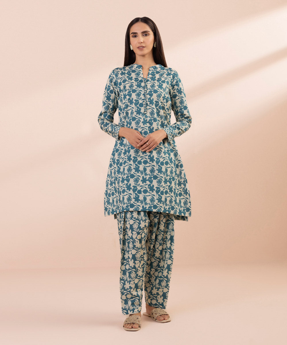 Experience fresh florals with our white and blue, printed two-piece featuring a lawn shirt and cambric trouser.
